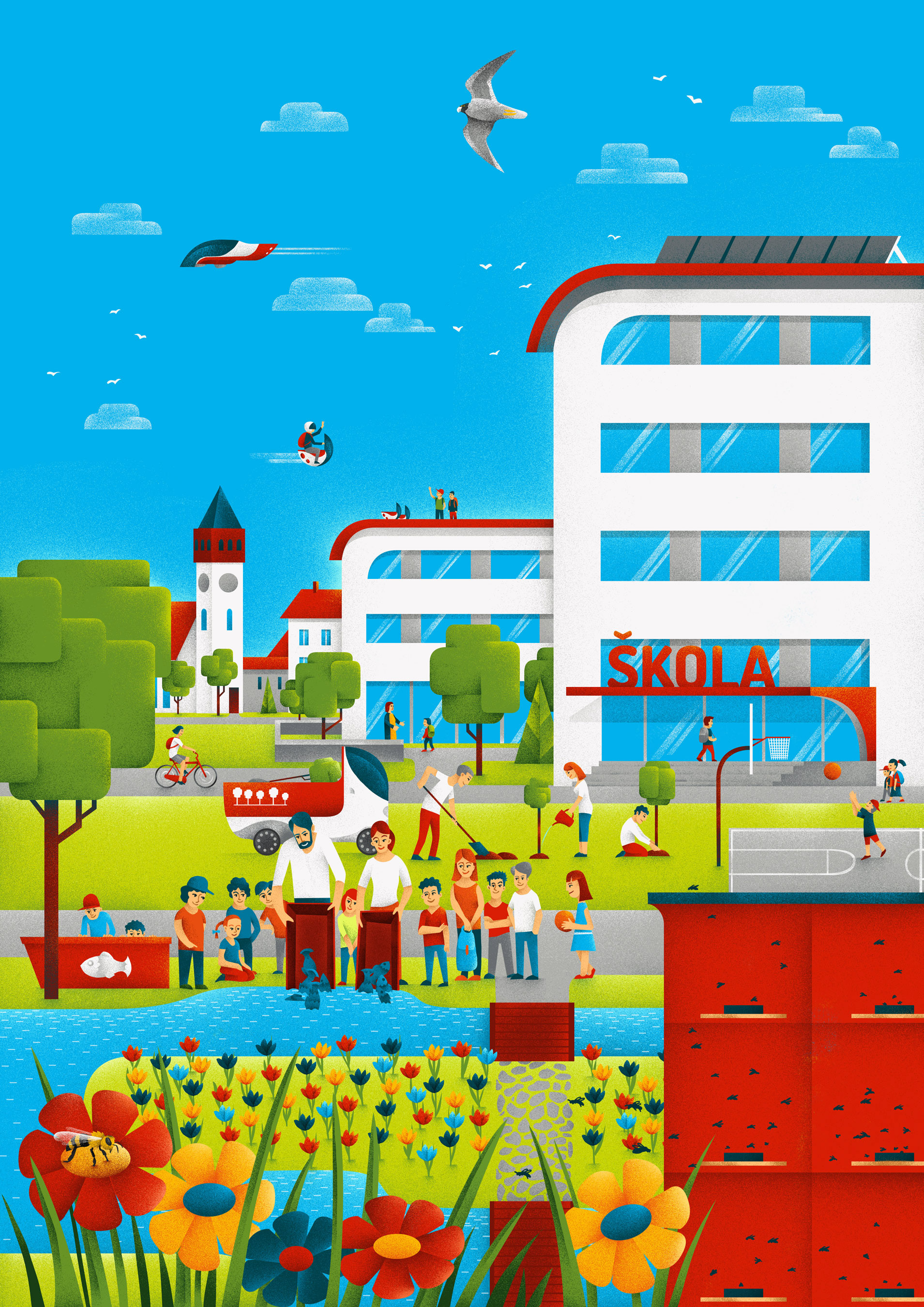 Popis / Description: během fáze skicování přišel klient s požadavkem, aby se ilustrace mohly spojit do jednoho velkého obrazu, čímž by vzniklo městečko.